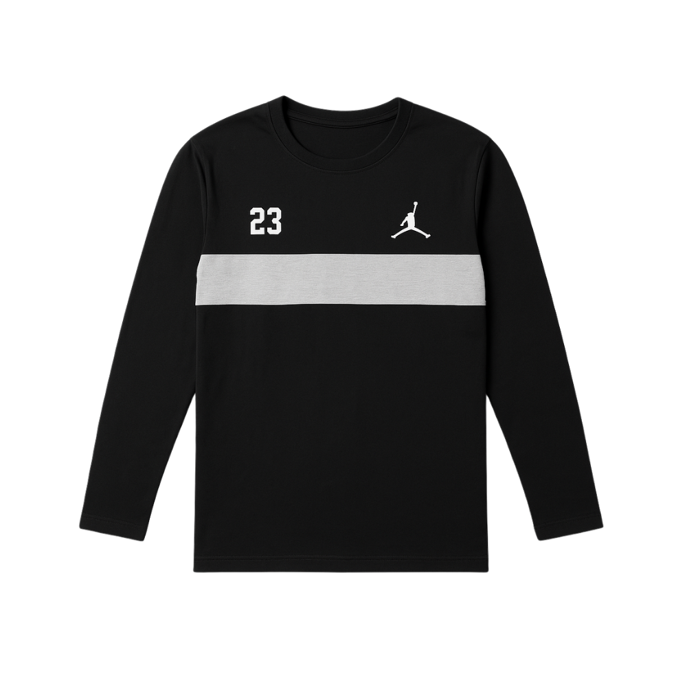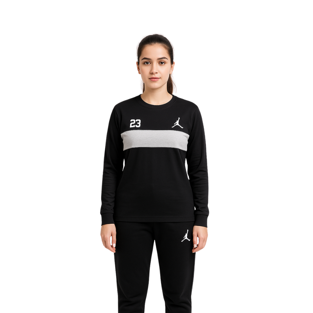 The long-sleeve top features the iconic Jordan Jumpman logo, the classic 23 print, and a sleek grey stripe across the chest—making it a perfect blend of sporty and chic. The matching jogger-style bottom includes the signature Jumpman logo, an elastic waistband, and a tapered fit that enhances your silhouette while keeping you comfortable all day long.