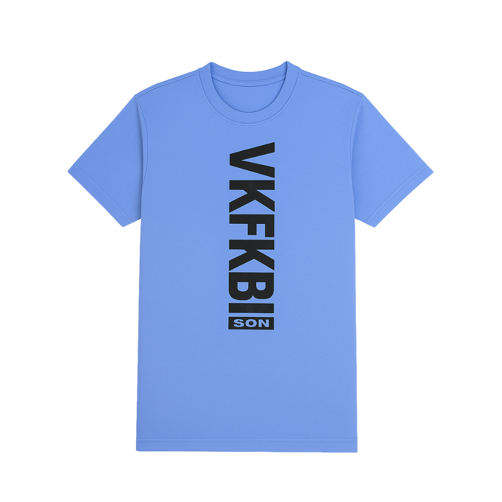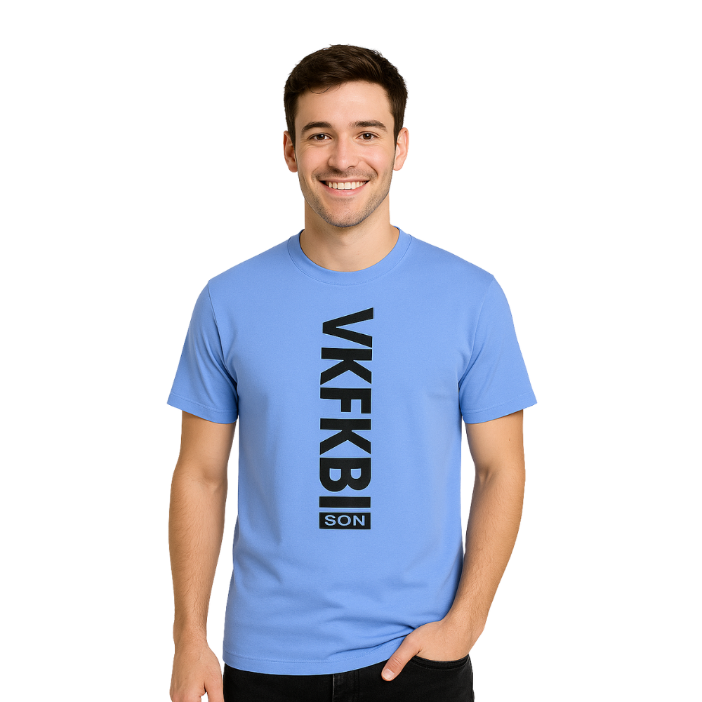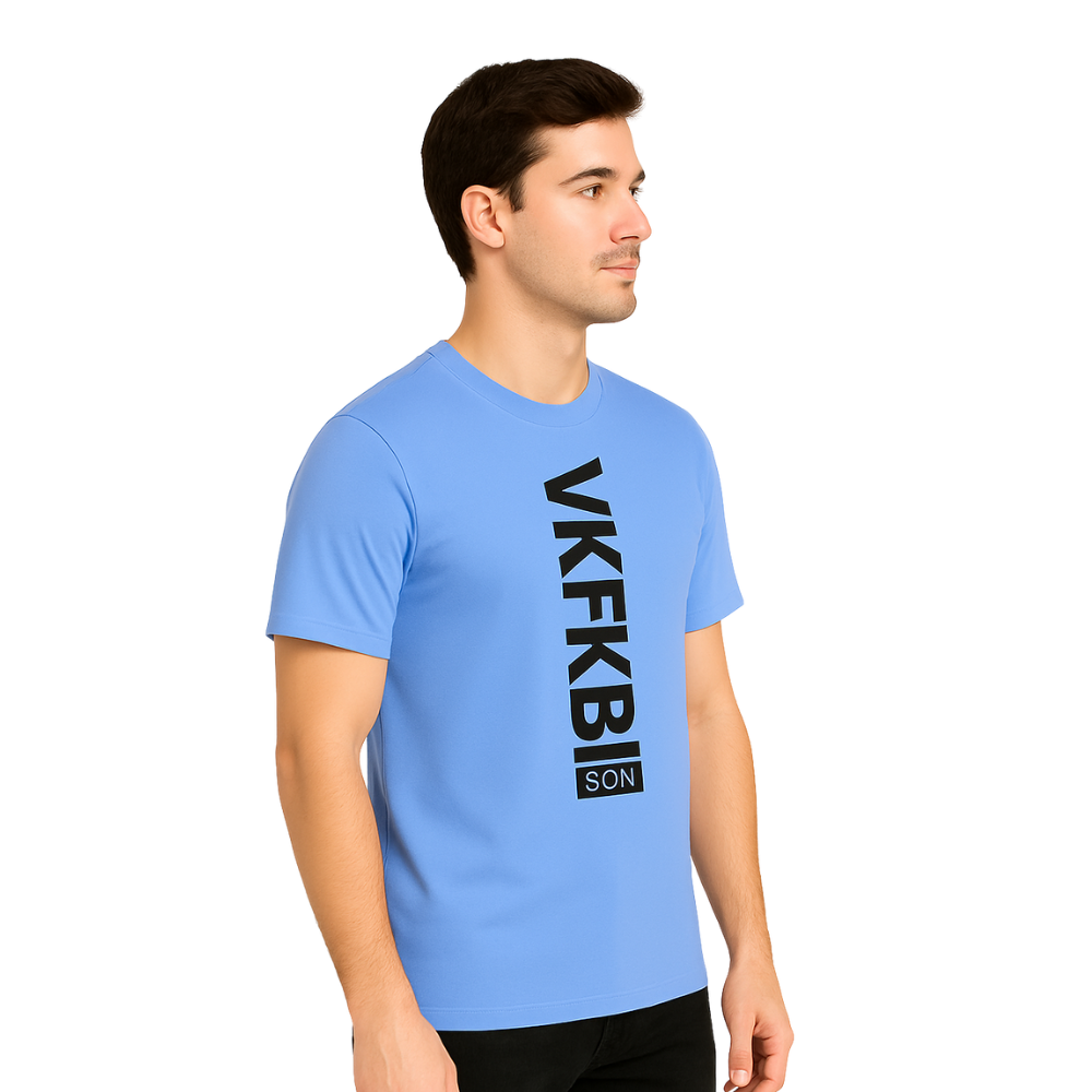 Sky blue VKFKBI vertical print T-shirt for men. Soft breathable cotton, premium stitching, trendy streetwear design—perfect for casual wear, summer fashion, and daily comfort.